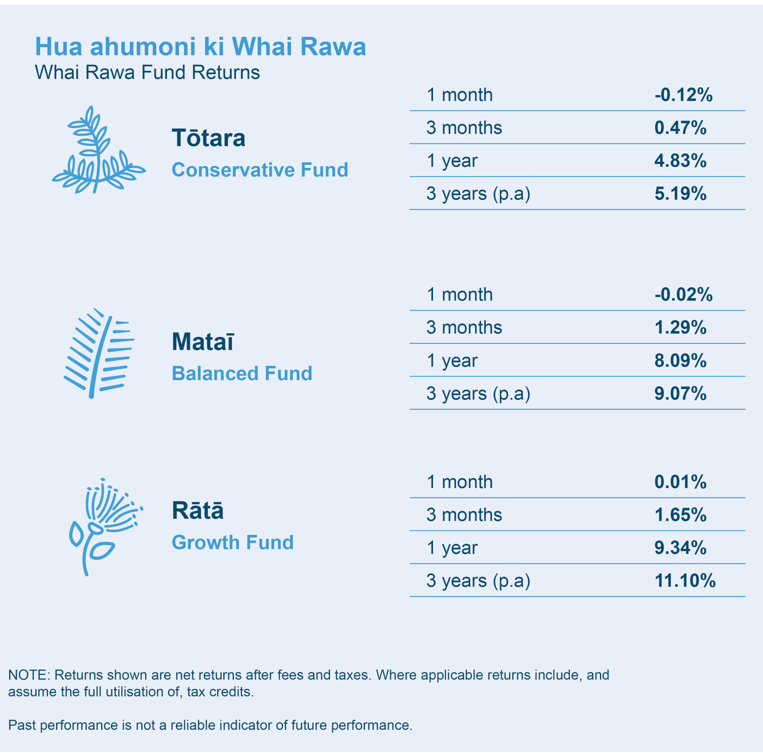 For the quarter our Tōtara-Conservative Fund returned 0.47%, our Mataī-Balanced Fund returned 1.29% and the Rātā-Growth Fund returned 1.65%.